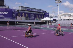 Kim se acomodó y se aseguró en la silla, para entender lo difícil que es manejar ese artefacto, dirigirlo para tratar de alcanzar una pelota y hacer una devolución. “¡Es duro!”, gritó cuando una bola se le fue.